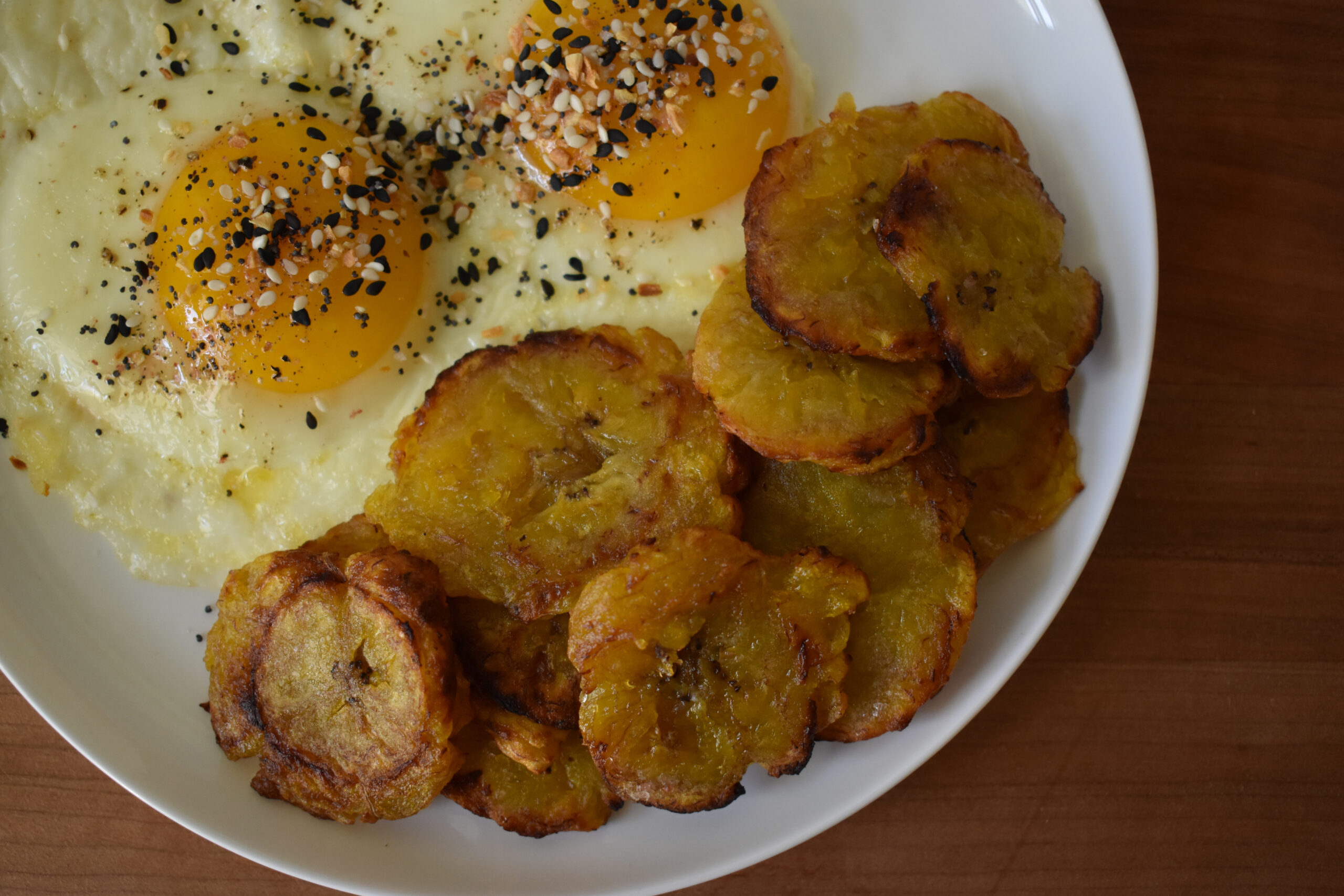 A super simple recipe for twice fried plantains. Using just one teaspoon of cooking fat, you'll have a sweet and crispy breakfast side on the table in no time!