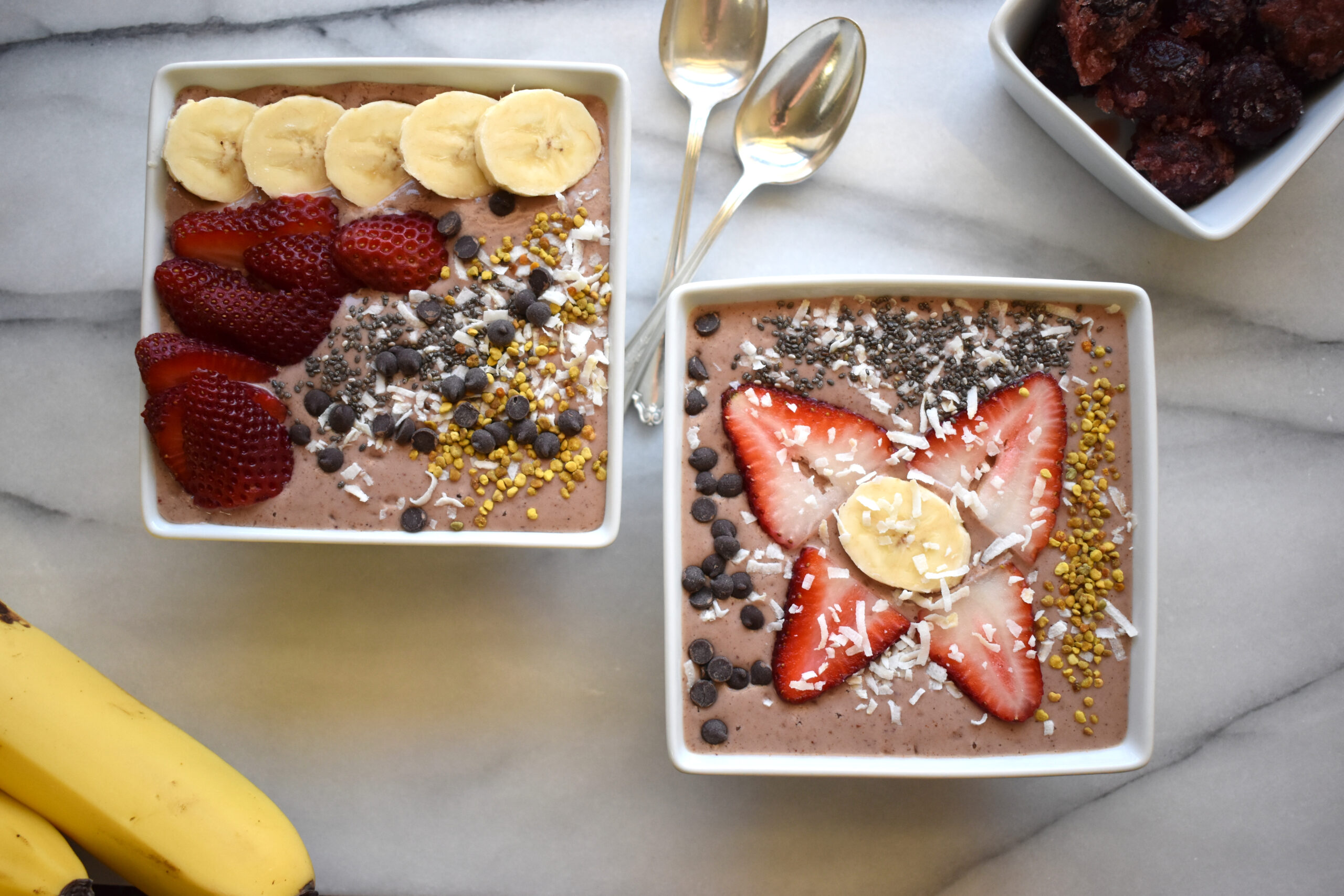 - Add all of the Smoothie Bowl ingredients in the order listed to a high speed blender. Blend 30-60 seconds until combined completely. Distribute smoothie mixture into two bowls.