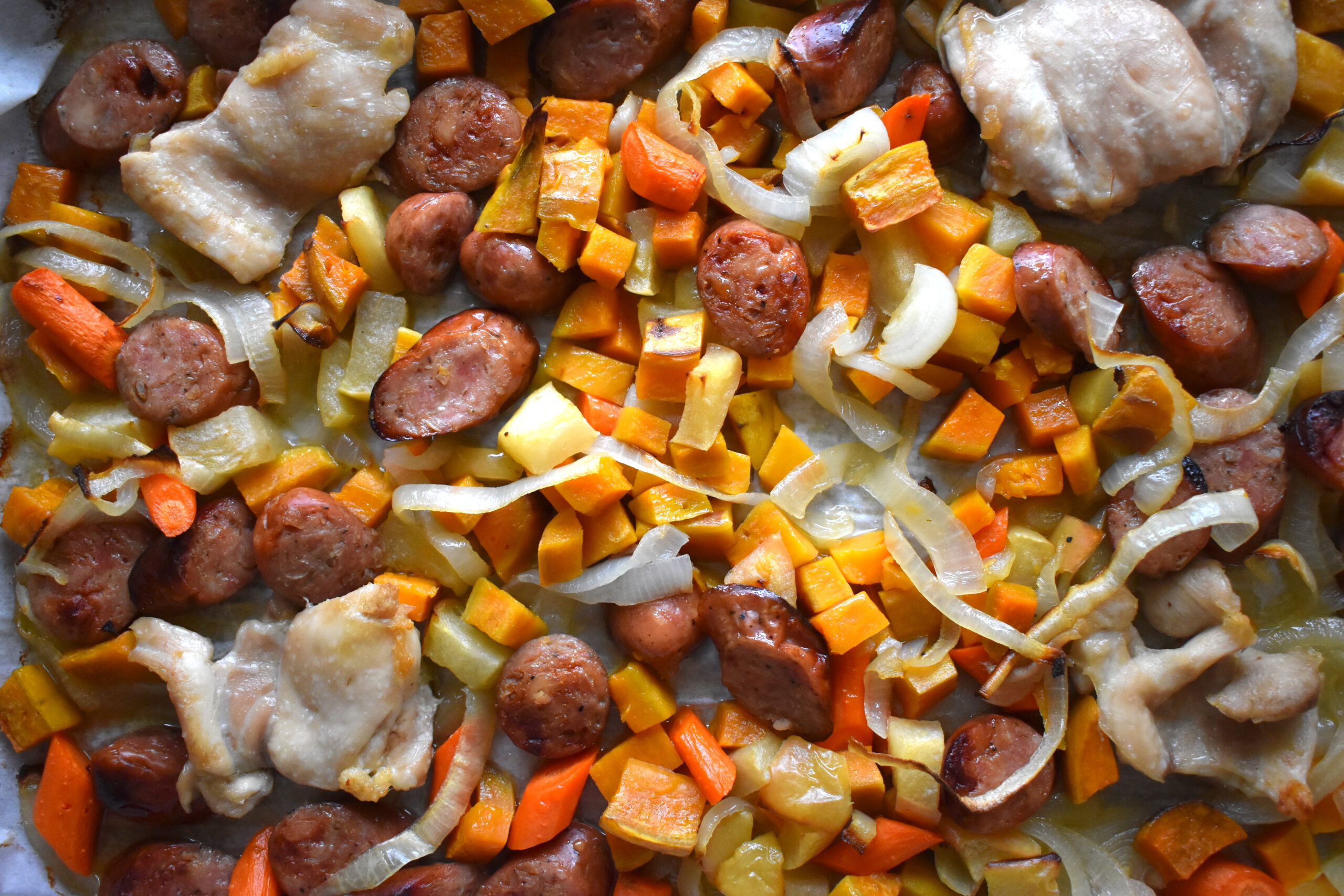 - Line a large sheet pan with parchment paper. Place the sweet potatoes, yellow onions, carrots, apples, and sausages on the sheet pan. Pour over 2 tbsp avocado oil. Season with sea salt to taste. Massage with your hands to coat evenly. Spread out in a single layer and create spaces to place the chicken thighs.
