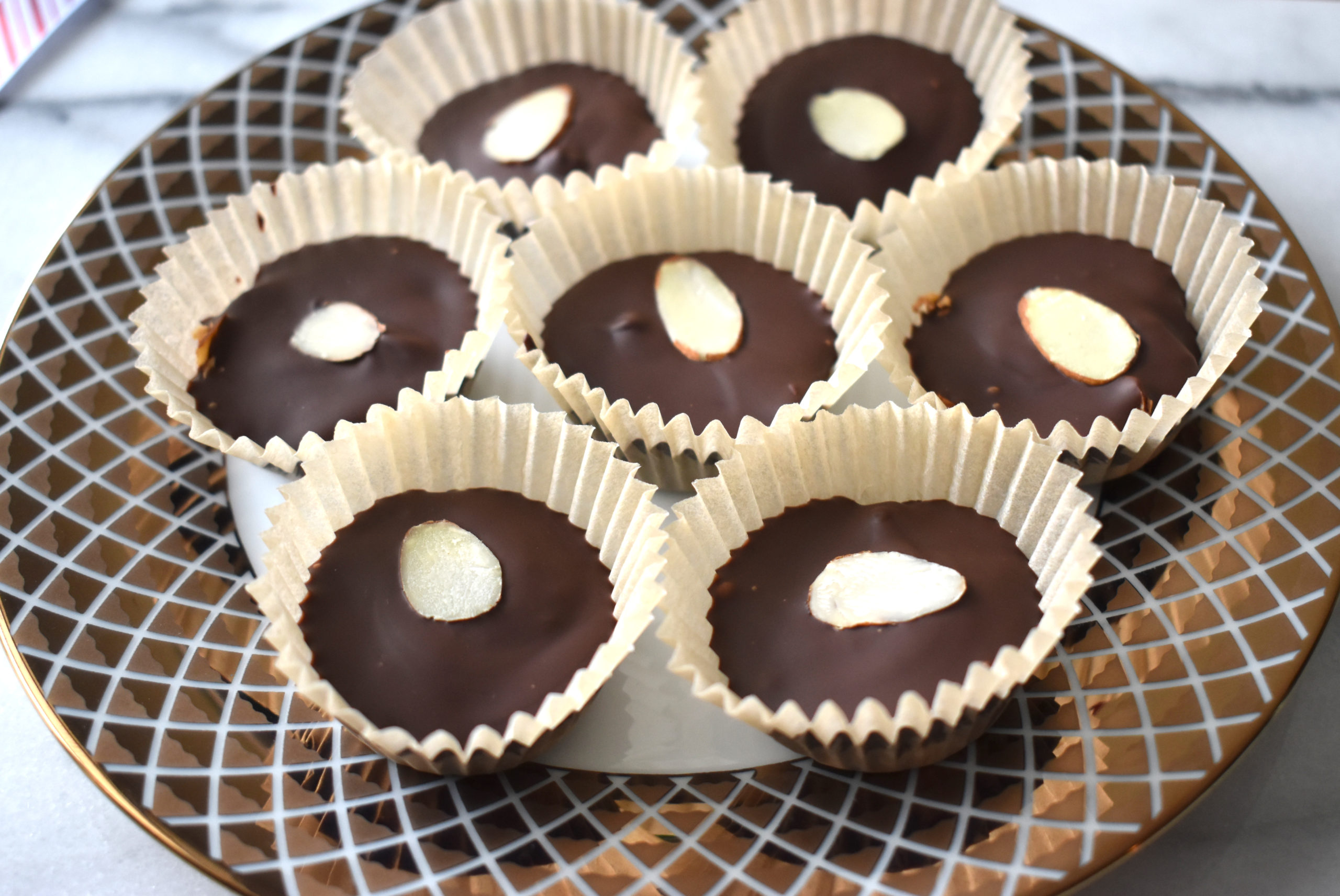 - Add the chocolate chips to a medium bowl and microwave in 30 second intervals, removing to stir, until melted. Use a spoon to add the melted chocolate on top of the coconut almond mixture. My cups were only about halfway filled which made for a nice bite-sized treat. Use the spoon to gently stir the mixture inside the cup to help the chocolate reach the bottom. Top each cup with one sliced almond, if desired. Chill in the refrigerator for at least one hour. Remove 10 minutes before serving and enjoy!