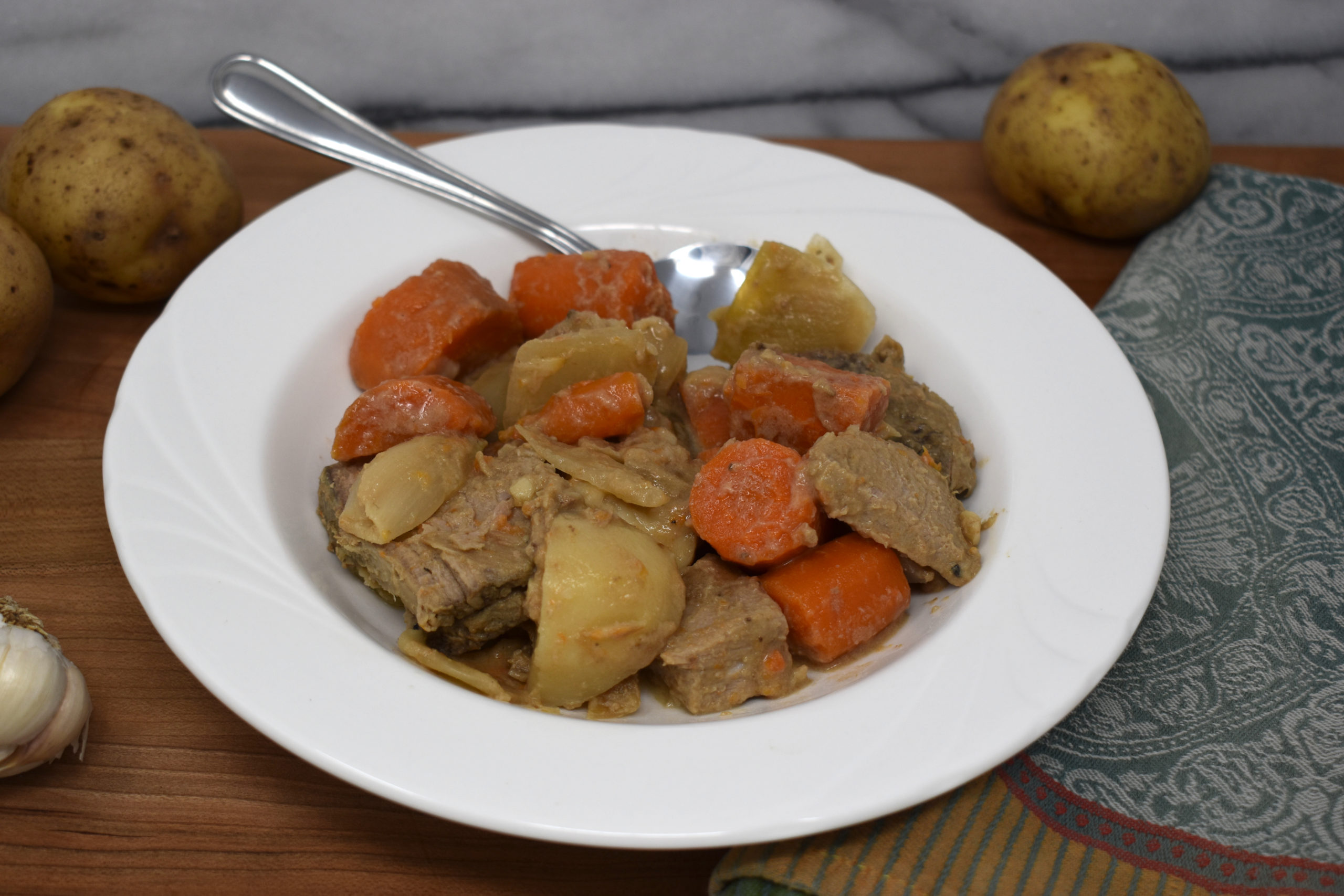 - Slow cook on low heat for 5-6 hours until vegetables are fork tender and roast is cooked through. Remove the meat from the slow cooker and place on a plate. Use a fork and a serrated knife to remove the excess fat from the meat; discard the excess fat. Cut the roast into chunks of your desired size and return the chunks to the slow cooker. Stir to coat evenly with the sauce. Serve warm and enjoy!