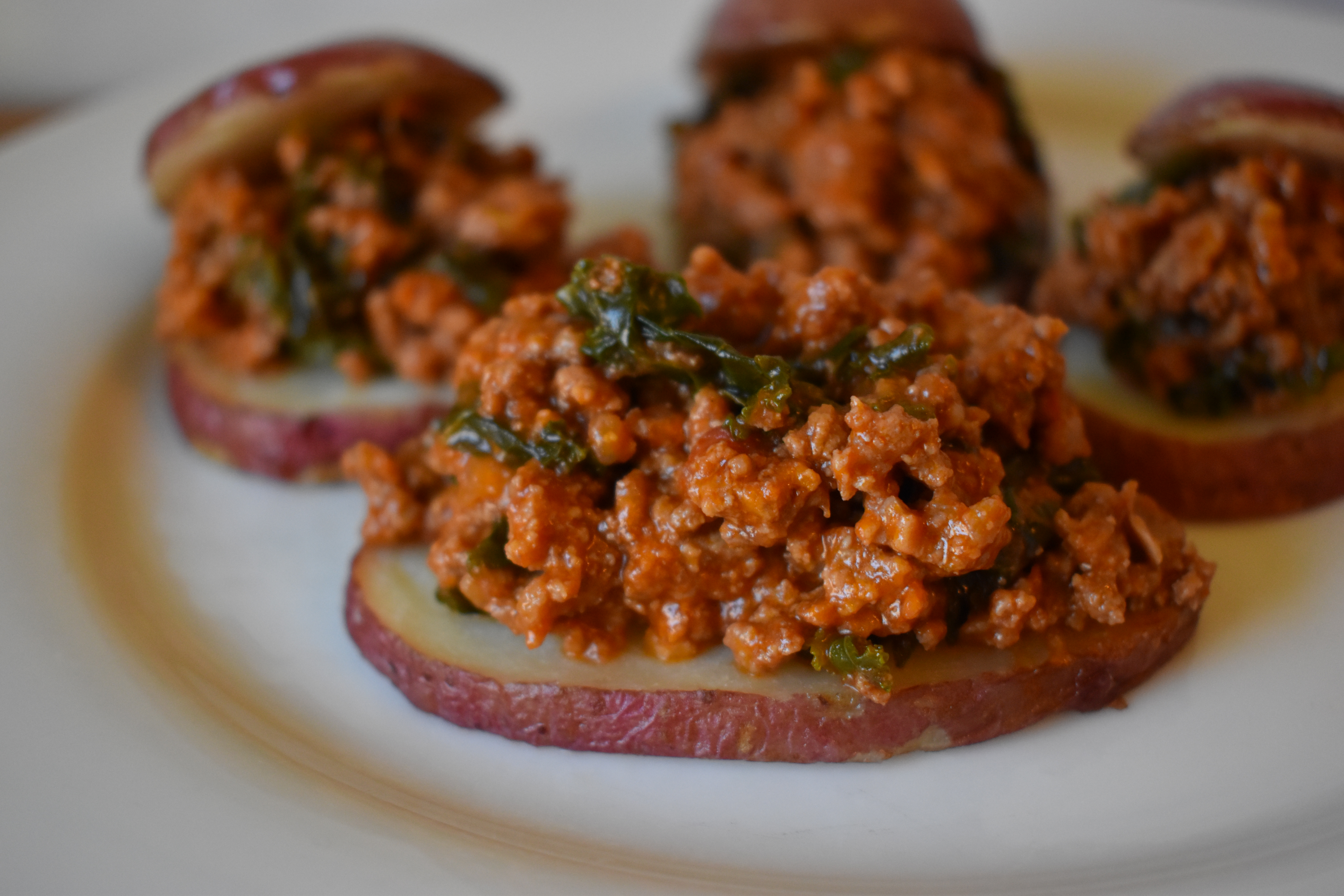 3. When the beef has browned completely, add the kale and stir to combine. Add the marinara sauce, stir to combine, and simmer on low until the potatoes are done cooking.