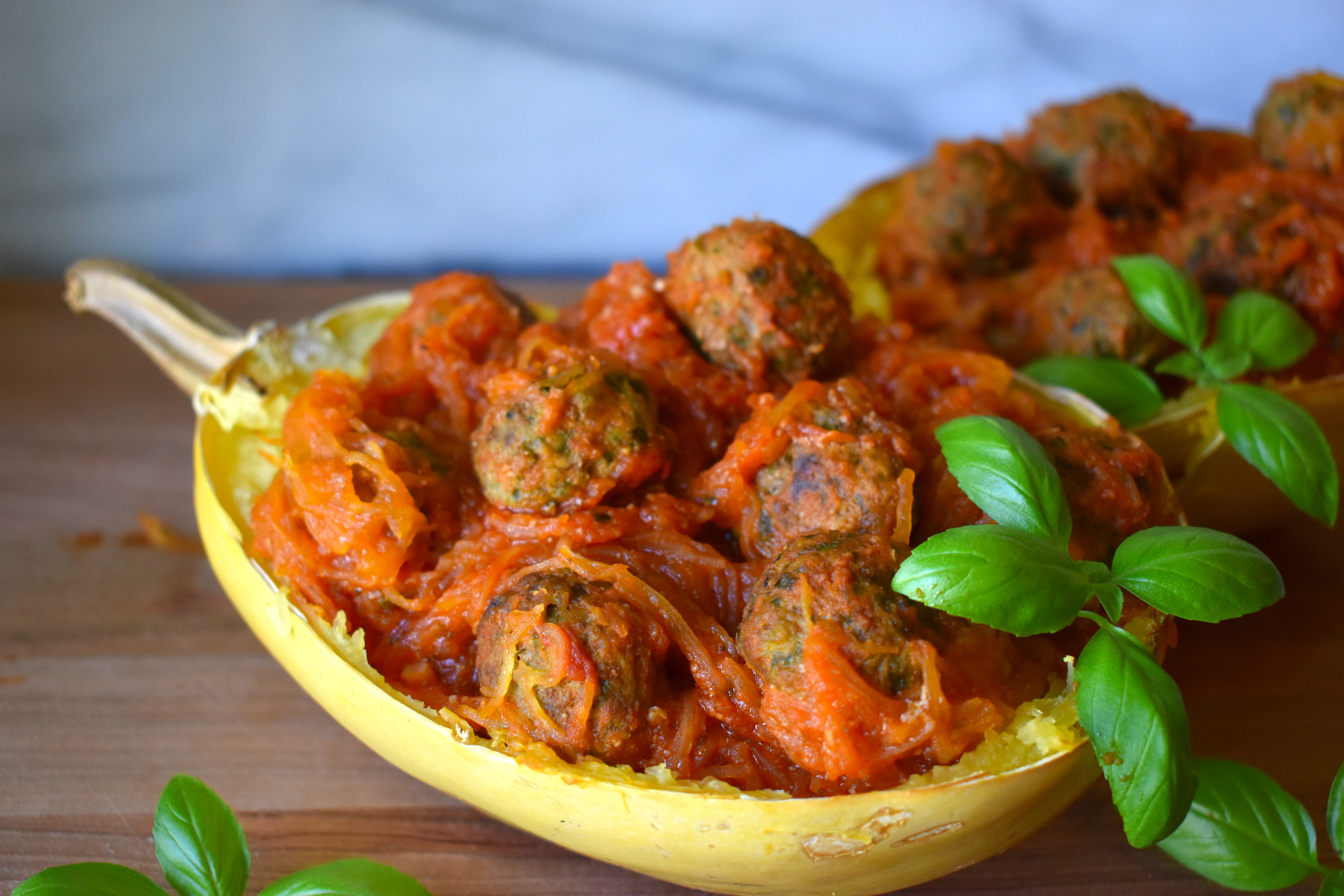 1. Arrange the racks in your oven to accommodate the meatballs on a higher rack and the spaghetti squash on a lower rack. Preheat oven to 400° F. Line a large sheet pan with parchment paper.