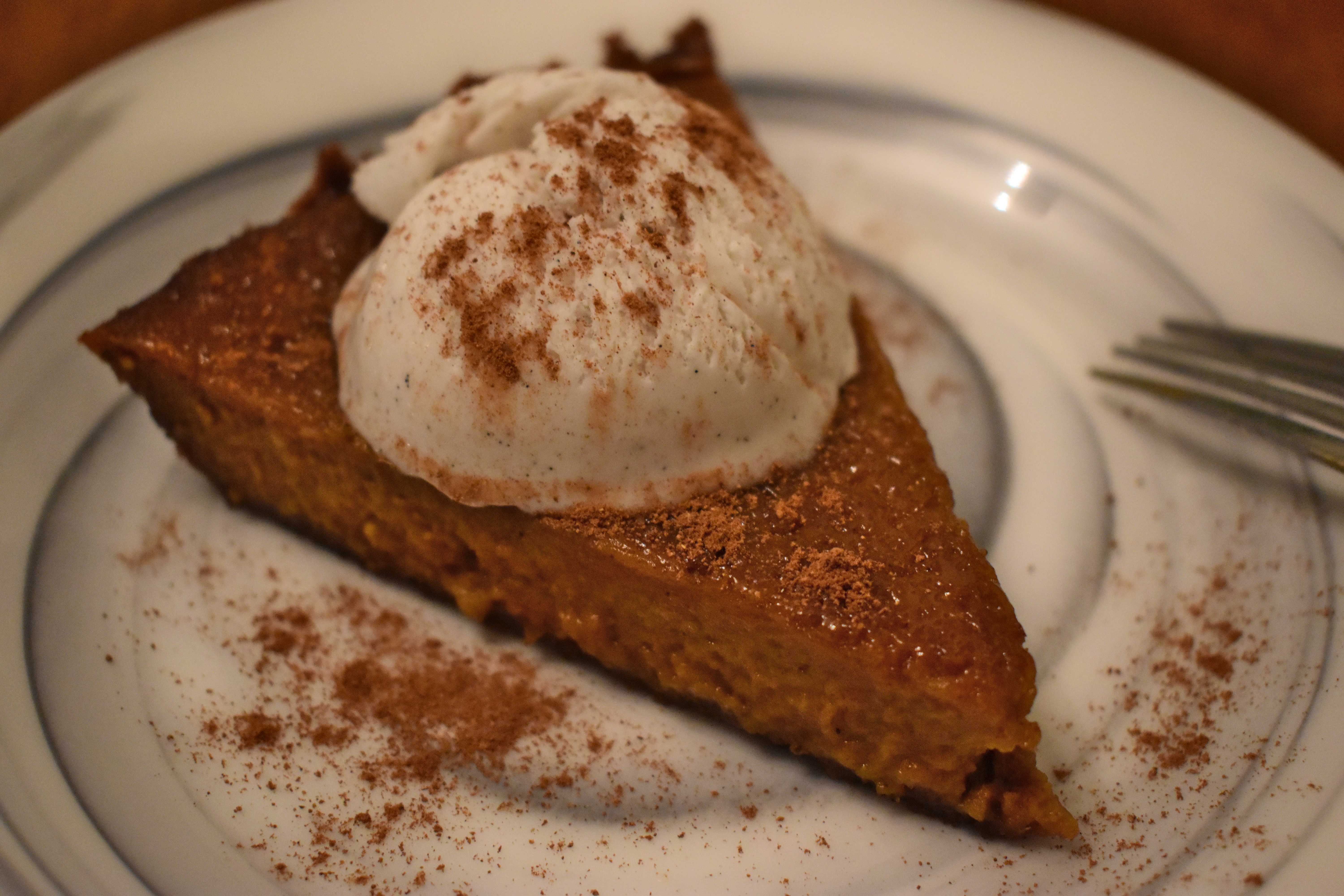 I am well aware that pumpkin pie is traditionally made with gross, dry, flaky, flour dough. As you can probably see from the pictures, I opted to take a different route for my crust. This somewhat resembles a graham cracker crust, and is indeed made from store bought cookies. I wanted to try Simple Mills Crunchy Toasted Pecan cookies because I thought the flavor would pair well with pumpkin pie. I was right! And yet I also think it’s neutral enough to use for a variety of different pies. Expect to see more pies on the blog over the coming months!