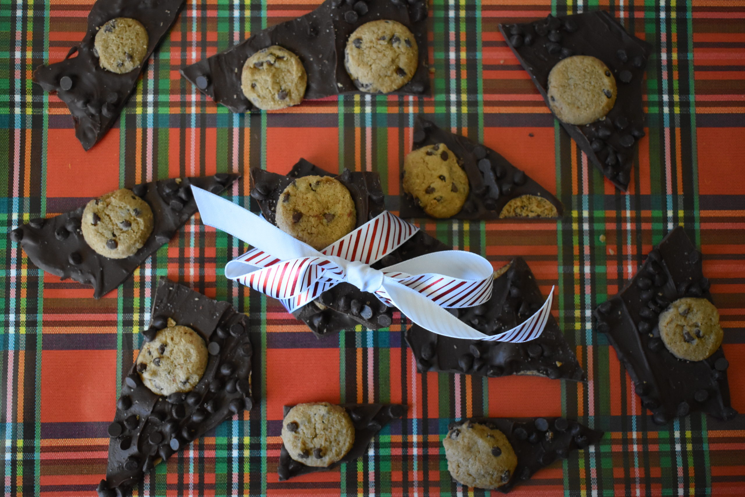 Of course you can add crushed candy canes if you want to make a more traditional peppermint bark. I’m not huge on candy canes, so I opted instead for gluten free chocolate chip cookies and some more chocolate chips. This bark is very customizable. Press whatever toppings you want into the melted chocolate, let it harden in the fridge for a bit, and dessert is done!