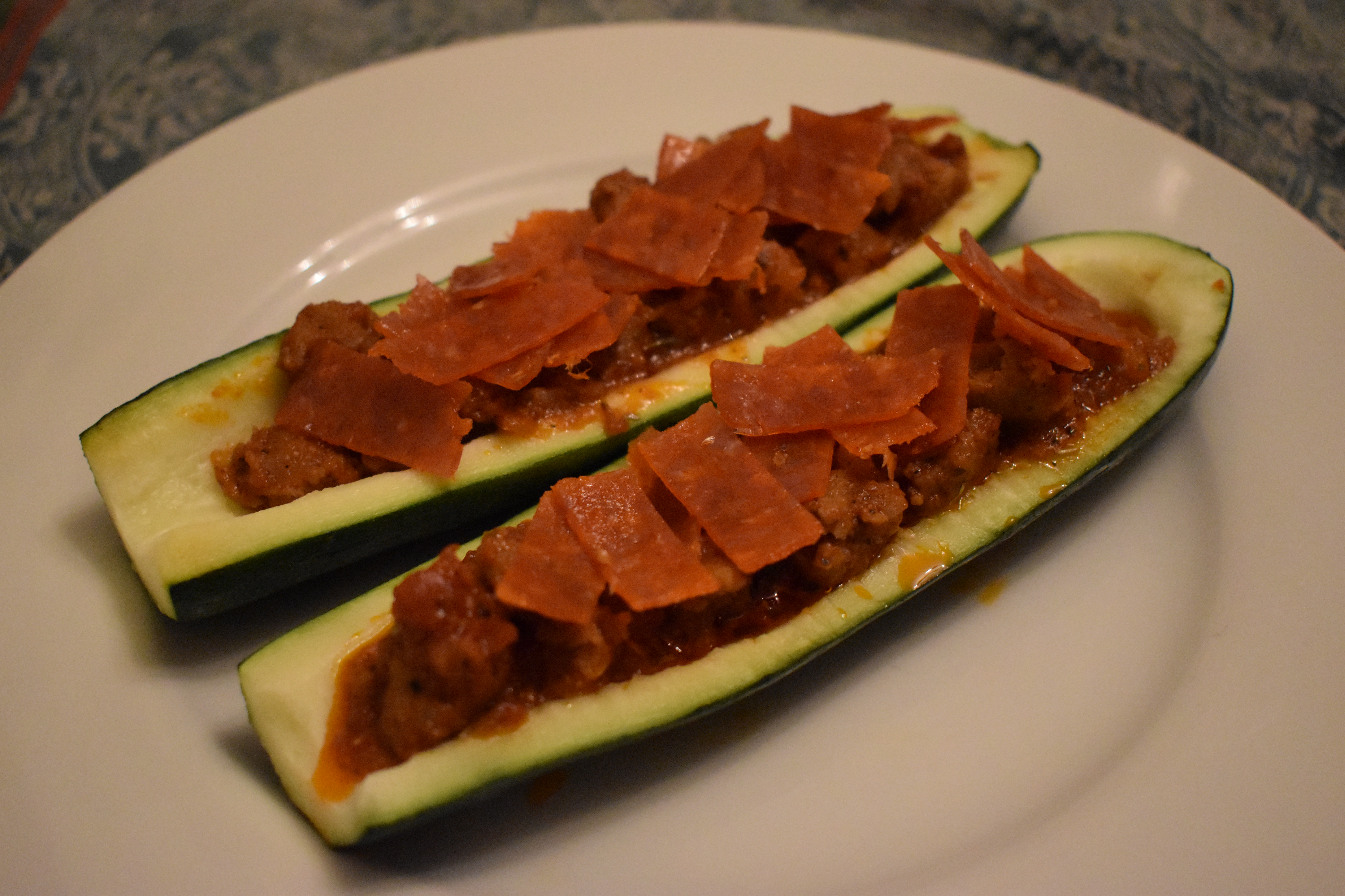 - When the zucchini is done, use a spoon to fill the insides of each zucchini half with the pizza mixture. Top with toppings of choice and serve! If not paleo or on Whole30 and you want to add cheese, now is the time to do so. Add cheese to each zucchini half as desired and place back in the oven until the cheese has melted.