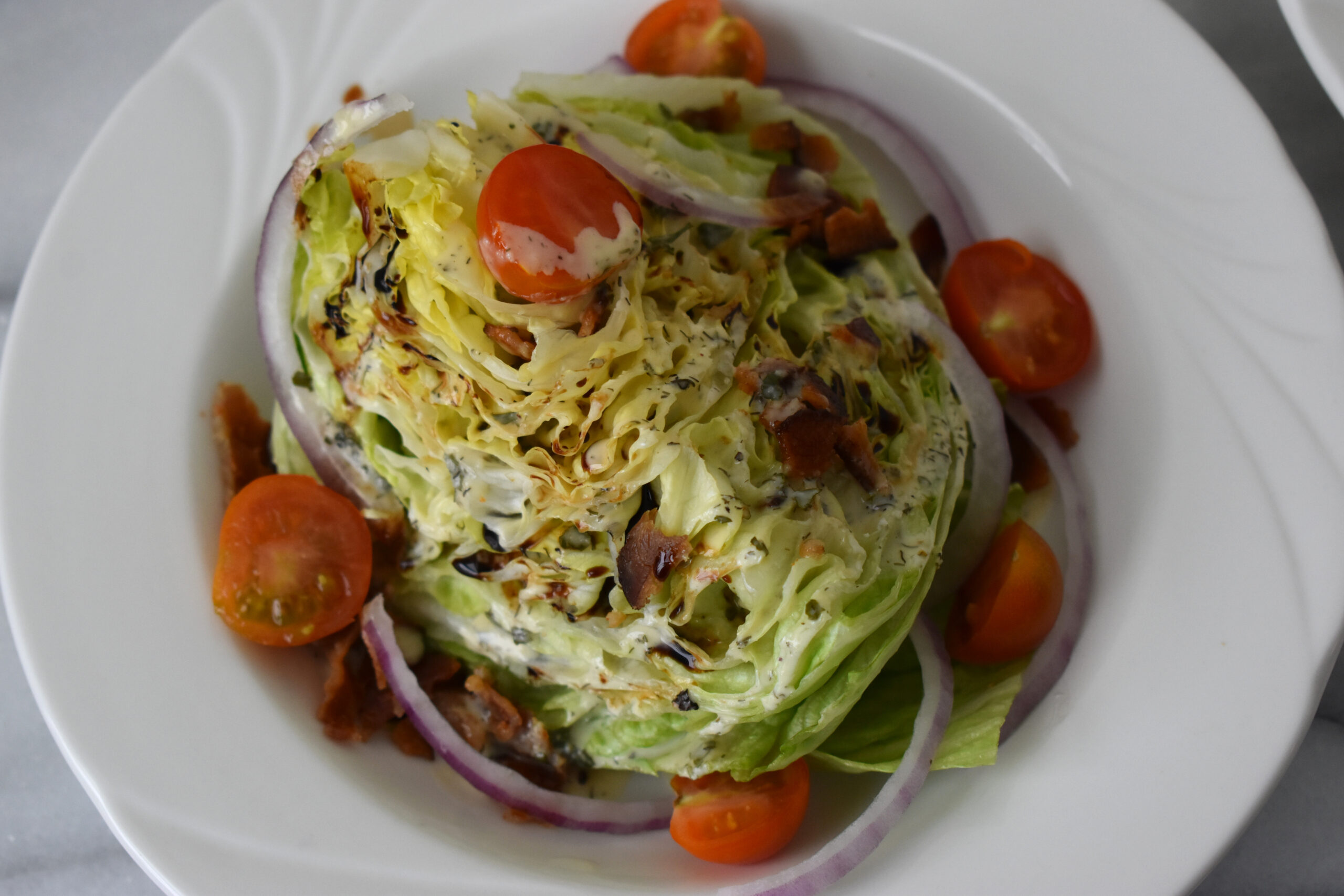 I LOVE a good wedge salad. I think my obsession started when I worked at Outback Steakhouse in college. At the time they had an amazing wedge salad. I wonder if it’s still on their menu. I ate a ton of those things when I worked there. I’m pretty surprised it took me this long to put a wedge salad on the blog since I love them so much. But at last, here we are! Better late than never, so they say.