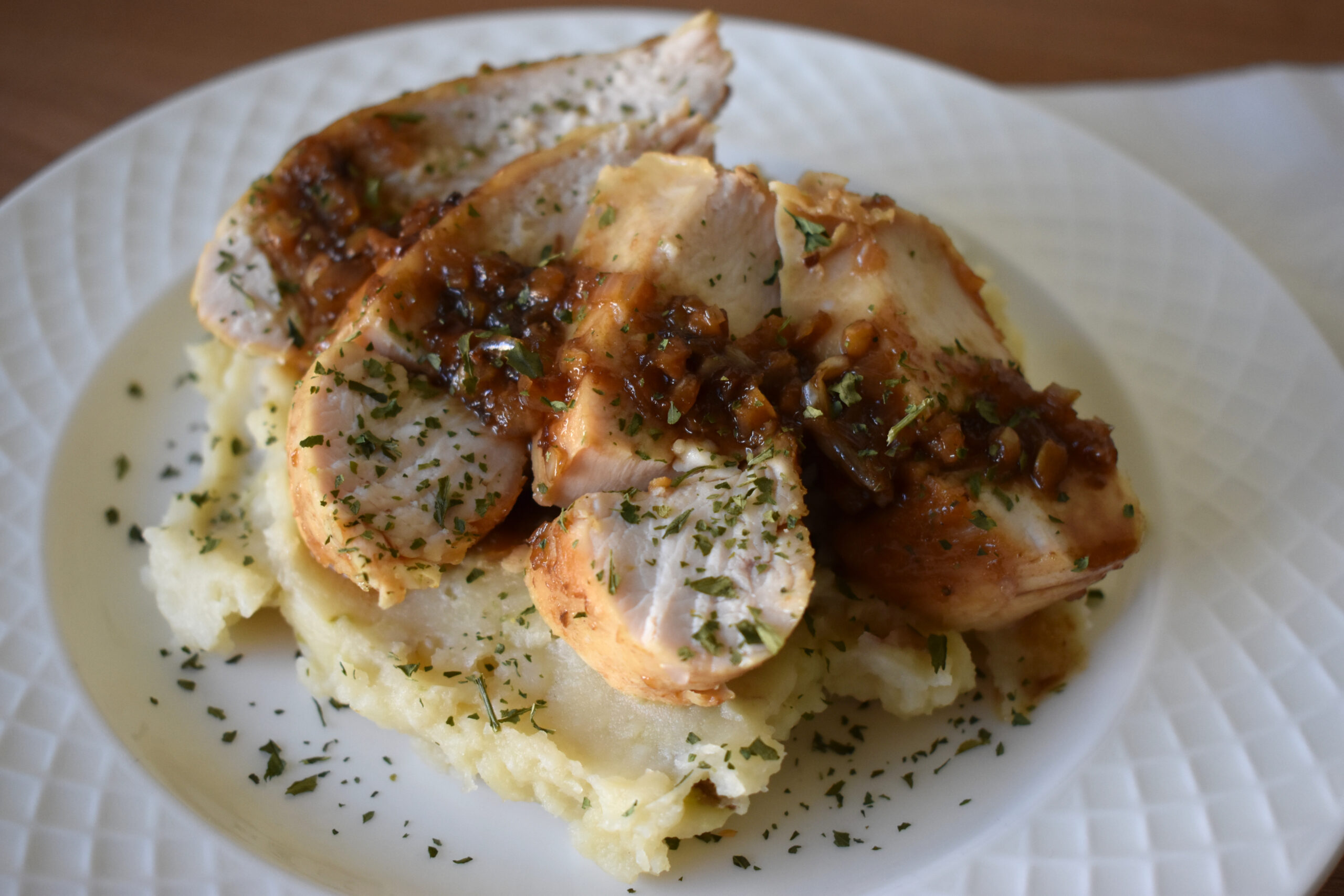 - To serve, slice the chicken and plate. Spoon the pan sauce over the chicken, serve hot, and enjoy!