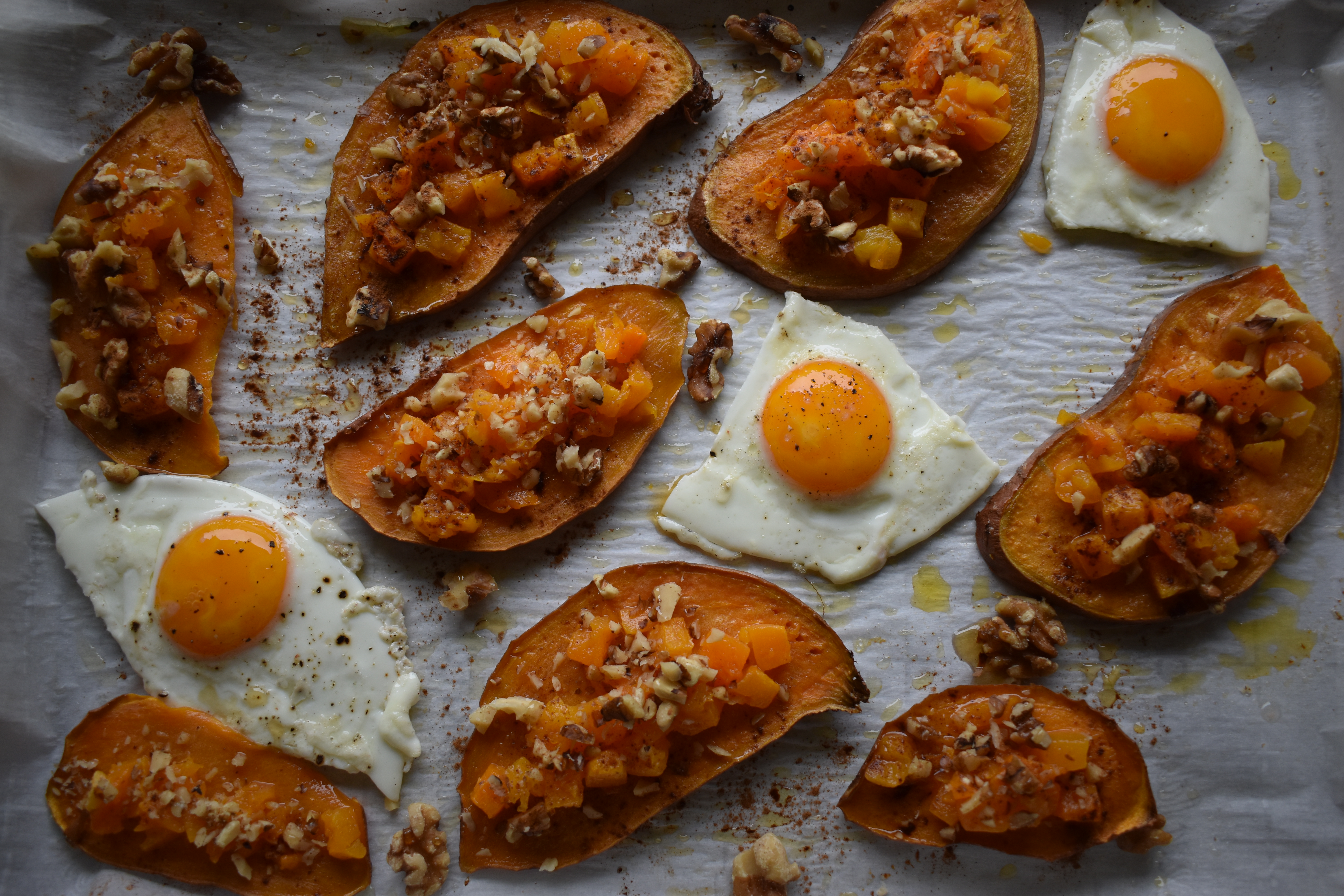 I took the gluten and the dairy out of Barcelona’s dish, but a lot of the flavors that I love are still present. This is a great recipe to make for breakfast on a fall weekend. The sweet potato slices and the butternut squash cubes cook pretty quickly, and while they’re in the oven getting all tender and tasty you can prep the rest of the ingredients for the sweet potato toasts and cook up some other things to serve on the side. As you can see I went with some over easy eggs. Sauteed kale, bacon, and sausage are other great ideas that would pair perfectly with these toasts. Get your healthy carbs in at breakfast in the form of sweet potatoes and butternut squash and get out and crush your day!