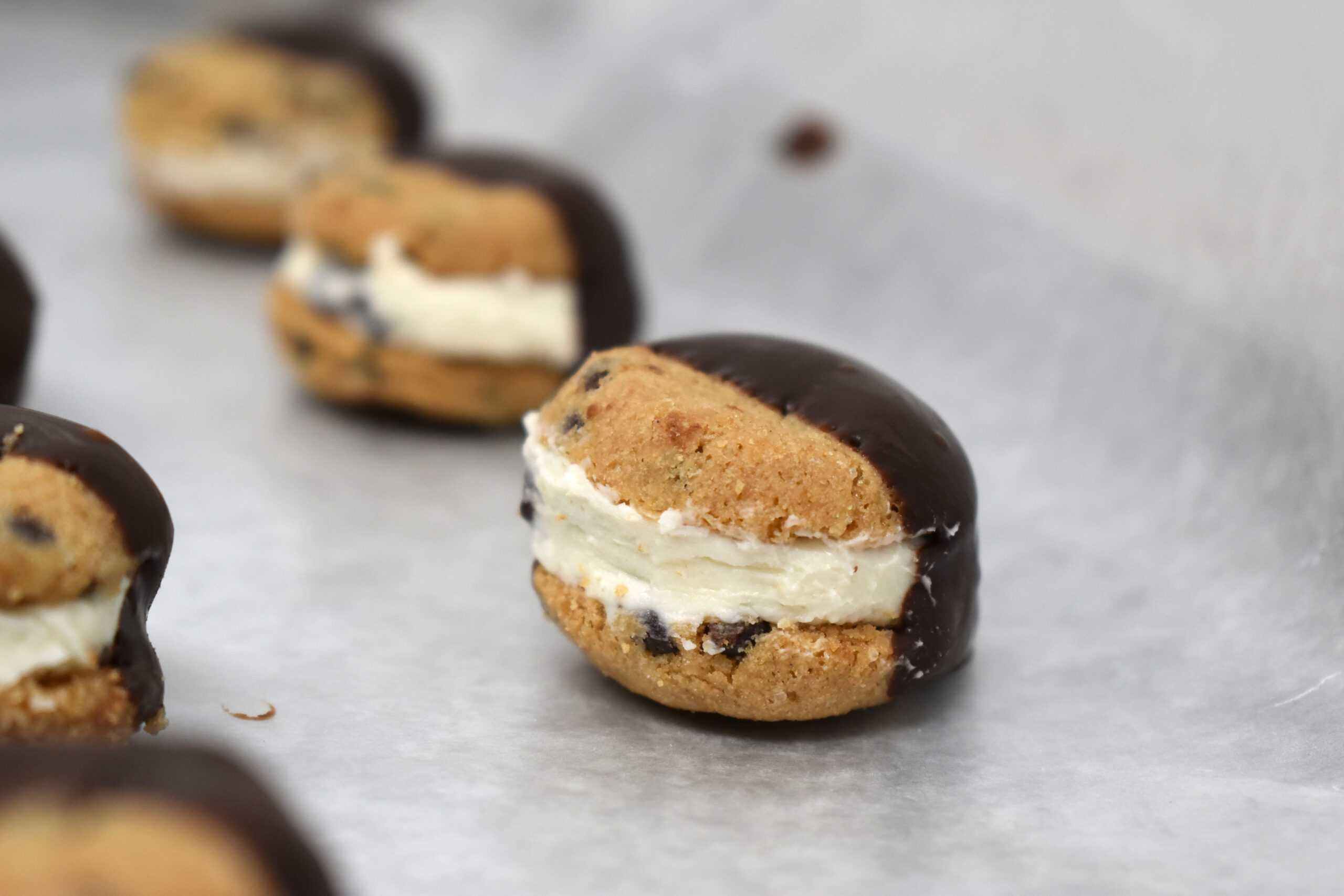 - Empty all of the cookies out onto a flat surface. To assemble the cookie sandwiches, take one cookie and use the butter knife to spread a small amount (about ½ tbsp) of the frosting mixture onto the cookie. Take another cookie and press it down on top of the frosting. Smoosh it down and wipe the excess frosting from around the cookie. Drag the cookie through the melted chocolate so that ¼ – ½ of the cookie becomes coated in the melted chocolate. Place on the sheet pan and repeat until all of the cookies are gone.