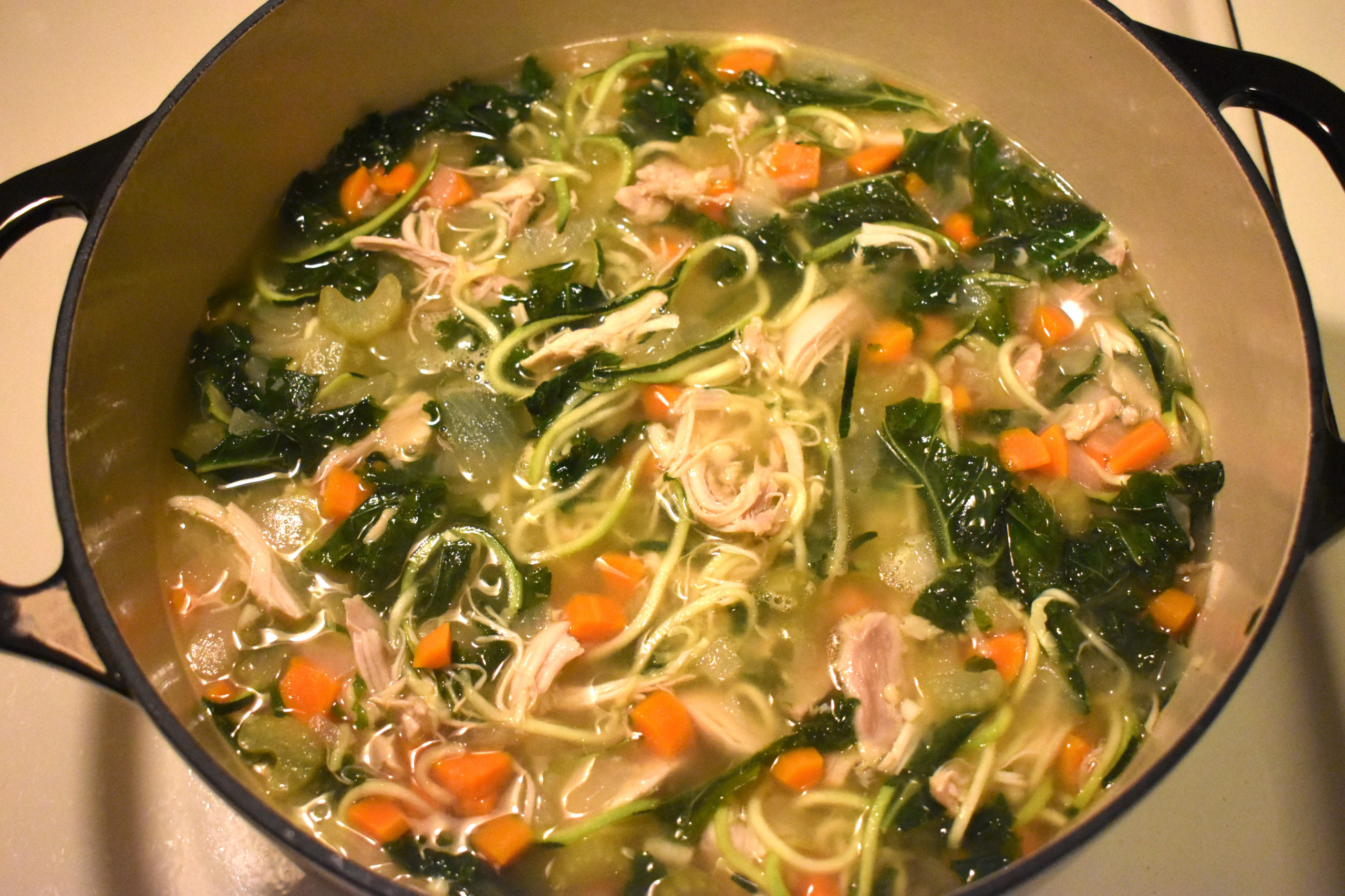 - After 1 hour, remove the bay leaves and ginger and discard. Pull the chicken thighs from the soup and use two forks to shred. Add the shredded chicken back into the soup with the zucchini and the kale. Simmer over medium heat 10-15 minutes more, until kale has wilted and zucchini has softened. Ladle into bowls, serve hot, and enjoy!